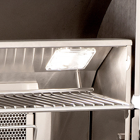 The 12-volt halogen lamps are perfect for nighttime grilling. This series also includes LED back-lit control knobs with blue flame icons that turn red when the grill is on and change in brightness as the temperature is turned higher. This is an awesome safety feature, reminding you to turn your grill off after use.