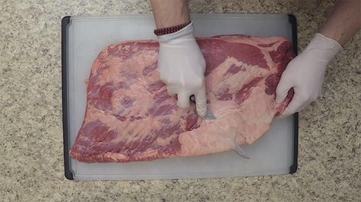 There's also a band of fat that runs deep in between the point and the flat and you'll want to remove as much of that as you can without digging too deep into the meat of the brisket.