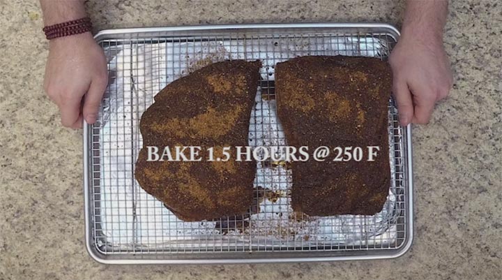 Once thoroughly rubbed and spiced, bake at 250 F for about 1.5 hours to create a nice crust or "bark" for a good contrast in textures.