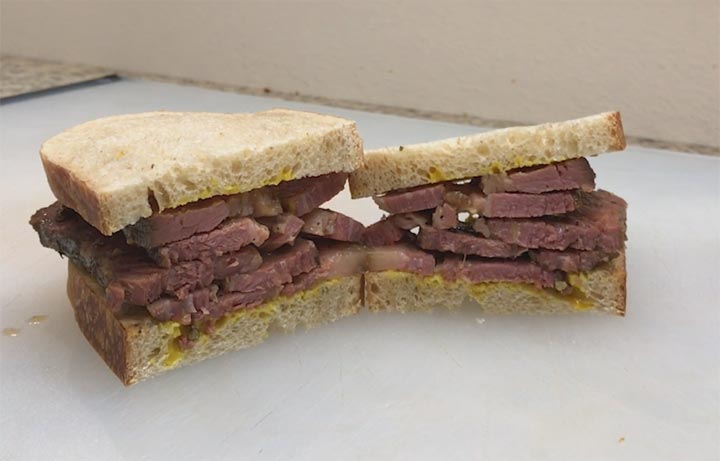 The world famous New York deli, Katz's Delicatessen, is known for their pastrami. They serve it stacked high on a rye bread with plenty of yellow deli mustard.