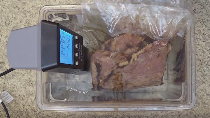 Set your immersion circulator to 155 F and place your beef in the bath. Cook for 48 hours for superior tenderness. You can adjust the time and temp if you'd like, but this is what I've found to be the sweet spot.