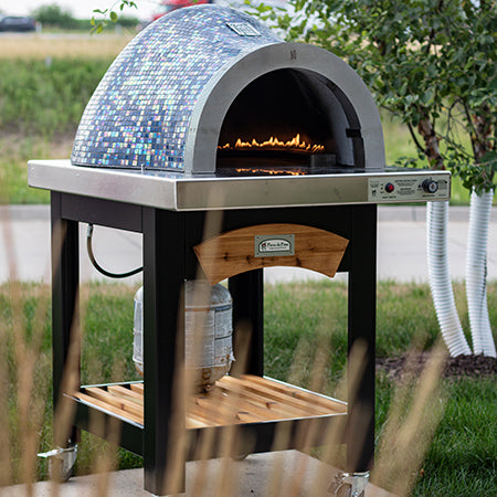 The HPC Fire FDP-FORNO-EI Forno Dual Fuel Wood & Gas Countertop Glass Tile Pizza Oven on Cart gives you the chance to cook delicious artisanal pizza in your own backyard in a high-quality, American-made package. Dual-fuel design lets you cook with gas or wood, adding smart versatility to the experience, and a handsome mosaic-tile exterior is sure to add a homey, old-world touch to your outdoor living space. The smart electronic ignition system lets you get started quickly and easily, and the stainless-steel cart it comes with provides convenient mobility, letting you store it out of the way when not in use. Through a combination of radiant, convection and conduction heating, you'll achieve deliciously crisp crust and bubbly cheese every time, making your gatherings the talk of the town.